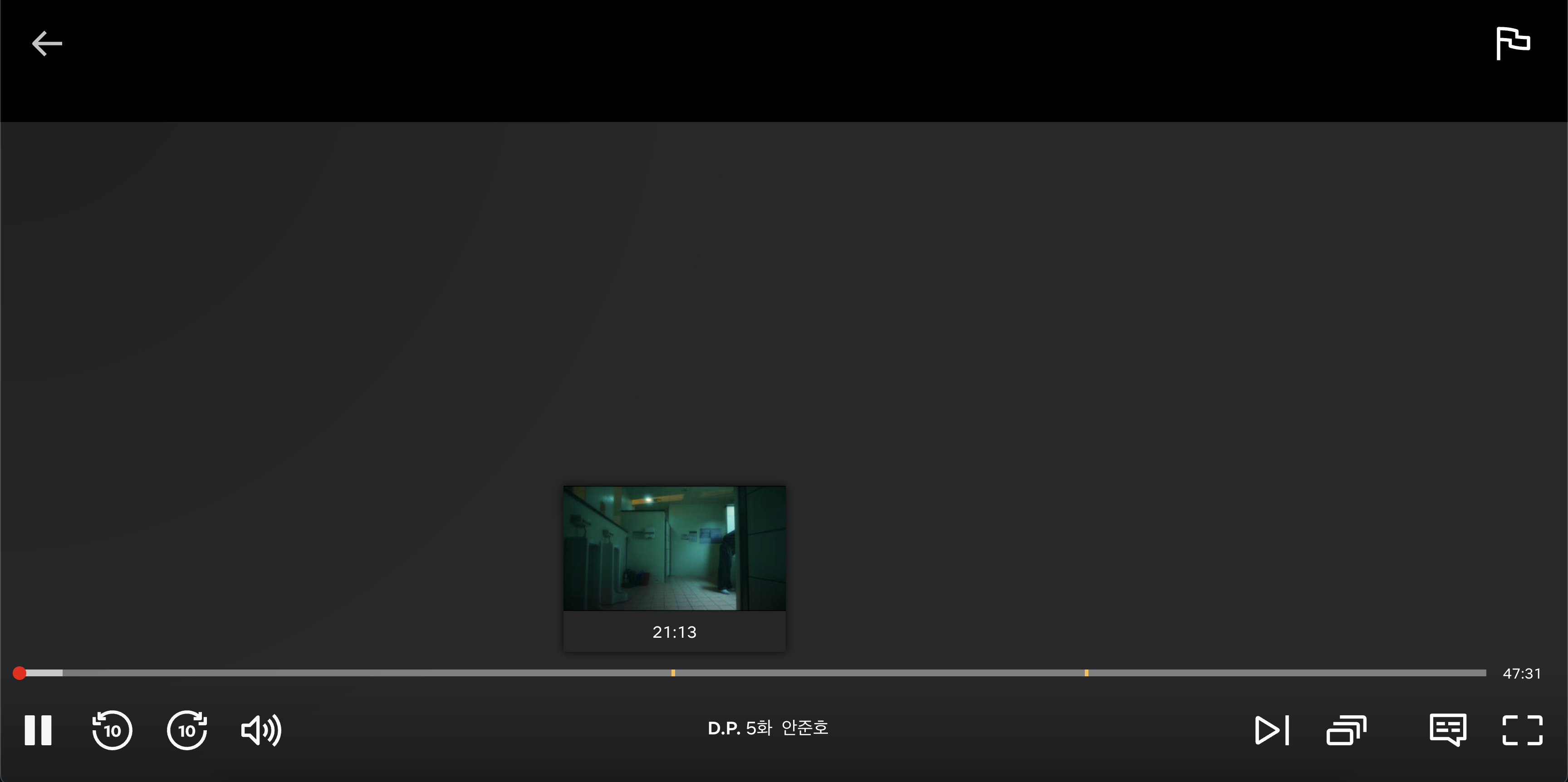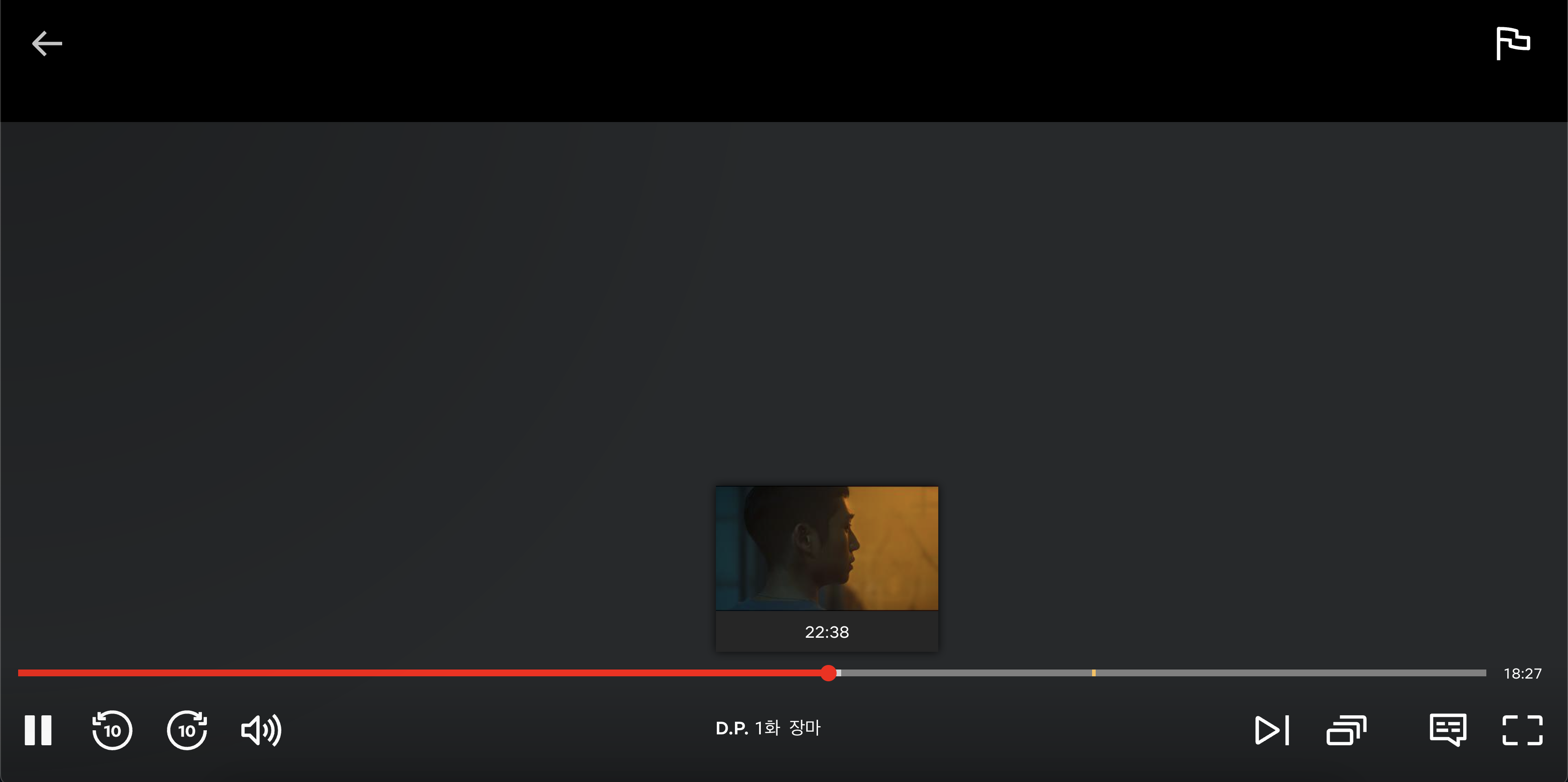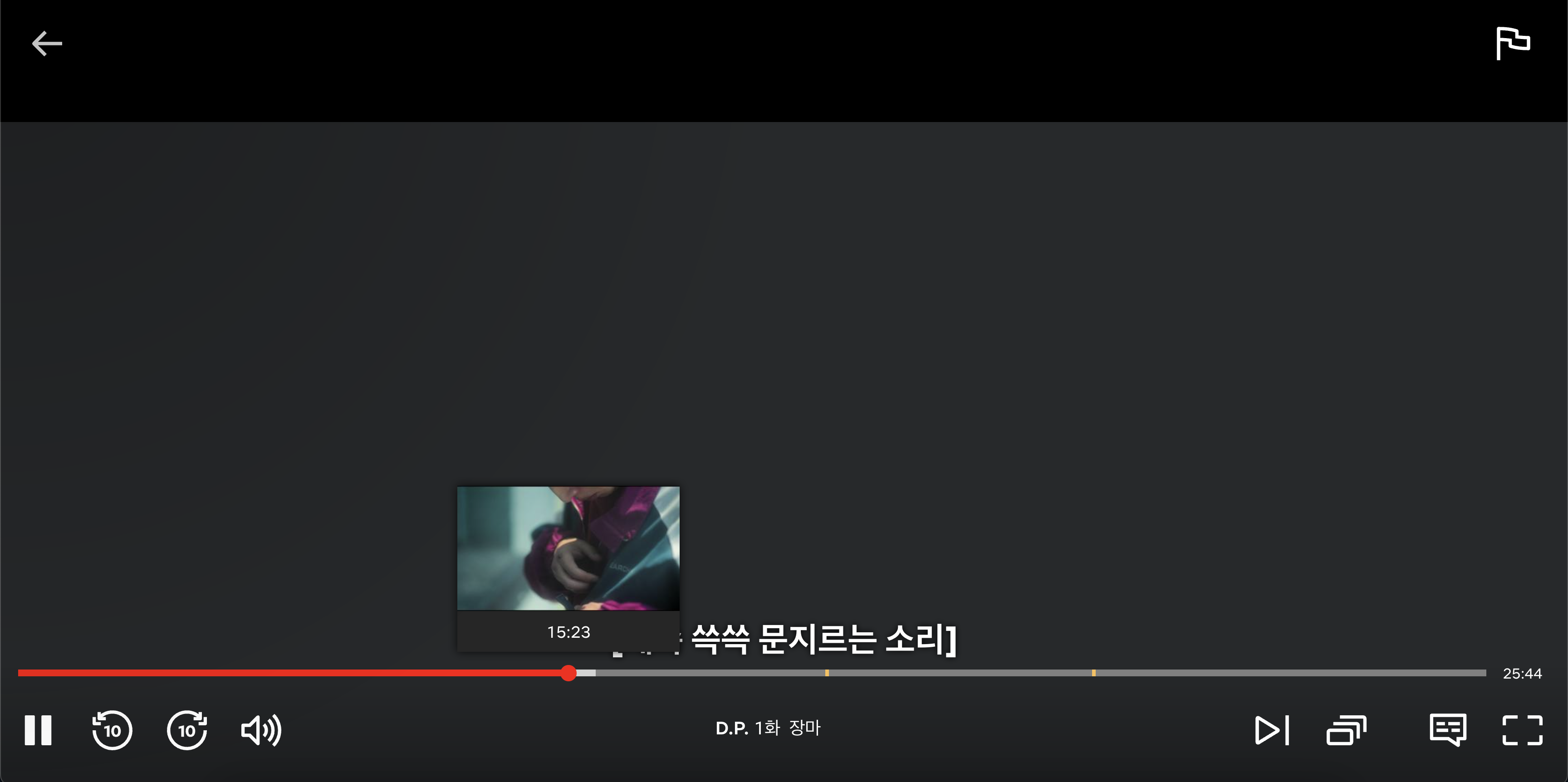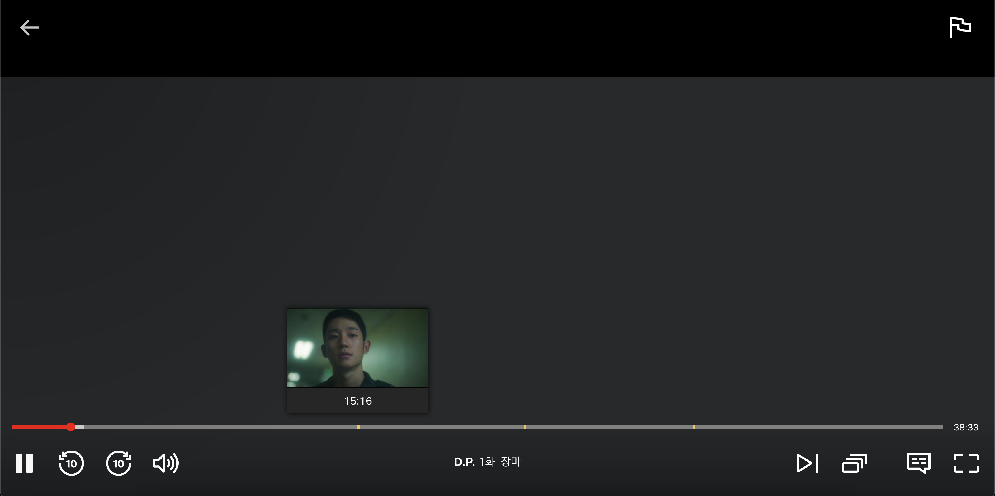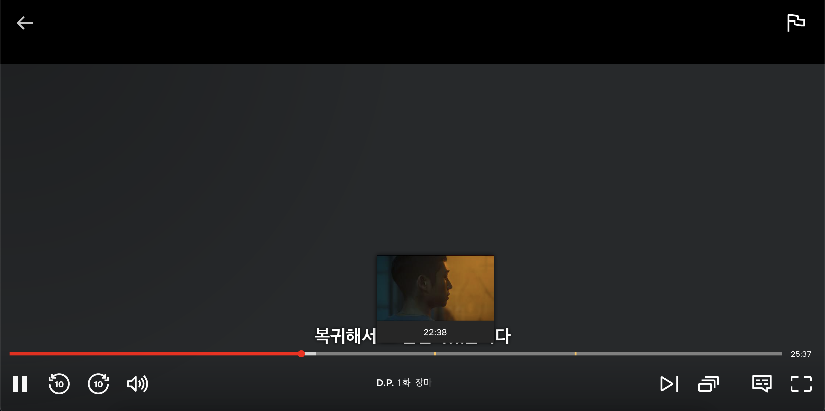 그리고 D.P. 시즌 2 같은 경우는 넷플릭스에서 전부 검토를 해서 그런지 나갔다 들어와도 광고의 재생바가 고정 돼 있습니다.