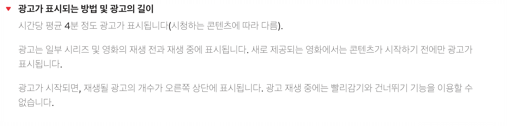 1시간당 4~5분 정도 광고가 나온다는 넷플릭스 공식홈페이지의 설명보단 훨씬 적게 나왔으나, 돈을 내고 보는데 광고가 나와서 언짢긴 했습니다만, 넷플릭스의 방대한 영상들을 싼 가격으로 볼 수 있고 광고 빈도가 적긴 해서 전 그냥 봤습니다.