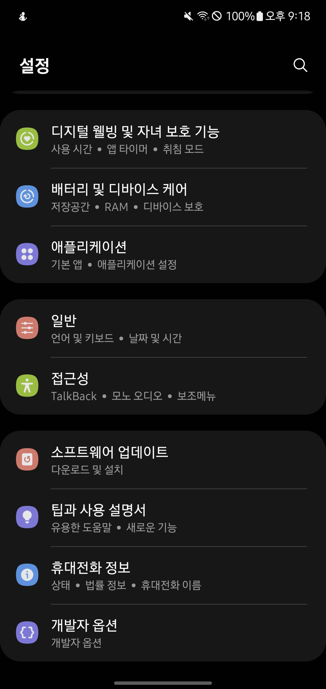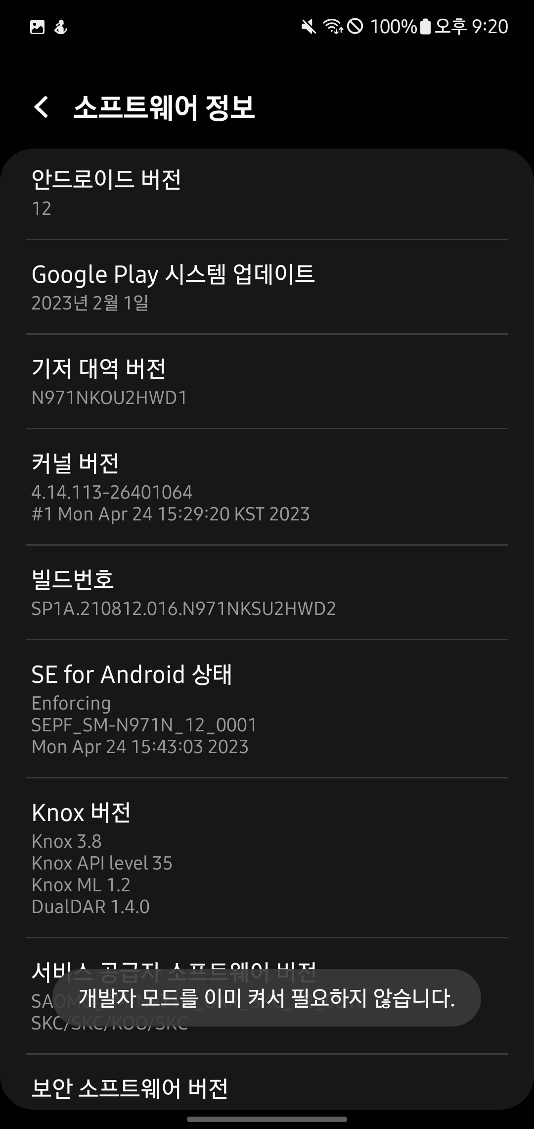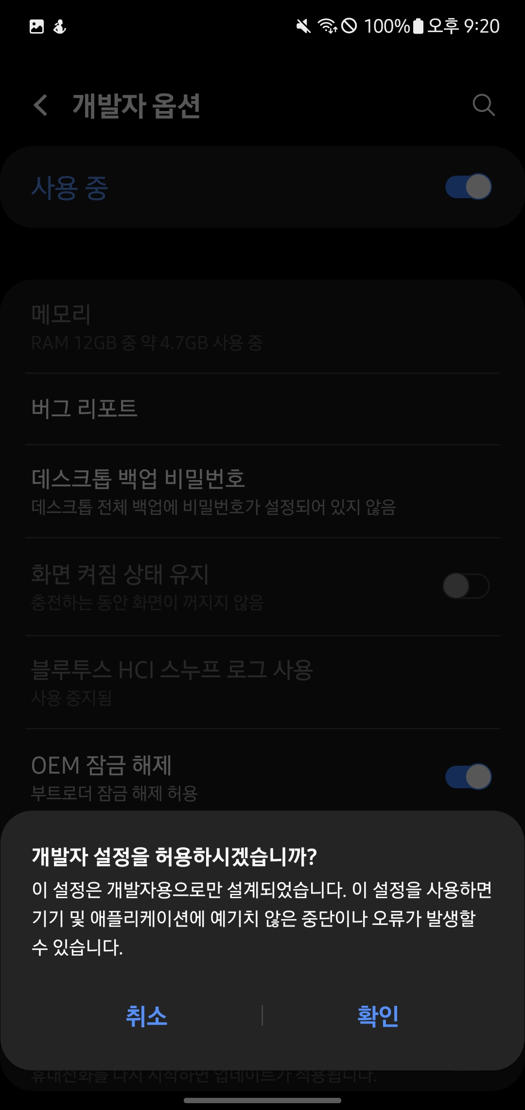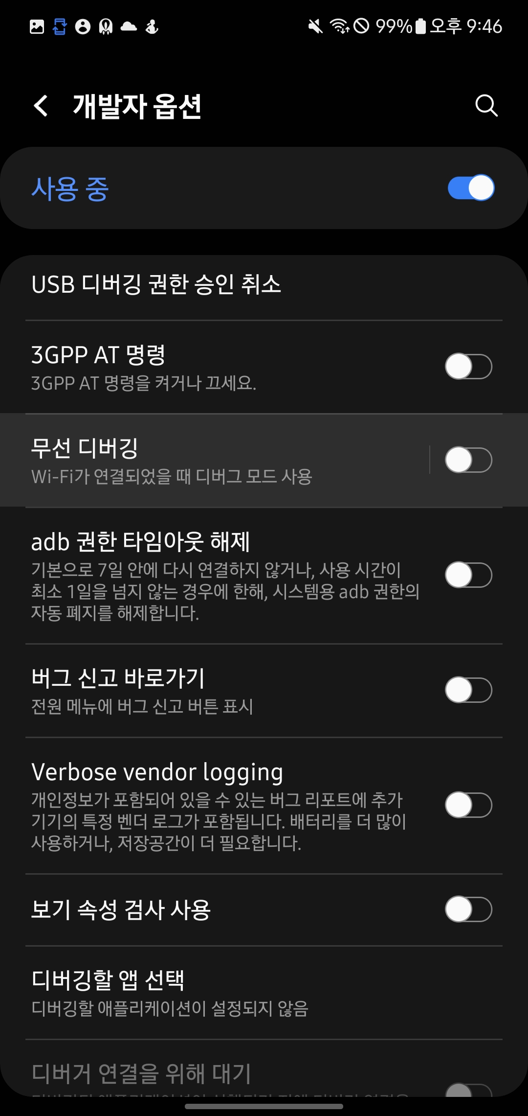 우선 맨 위의 개발자 모드가 활성화된 휴대폰으로 개발자 모드에 들어가 줍시다.
