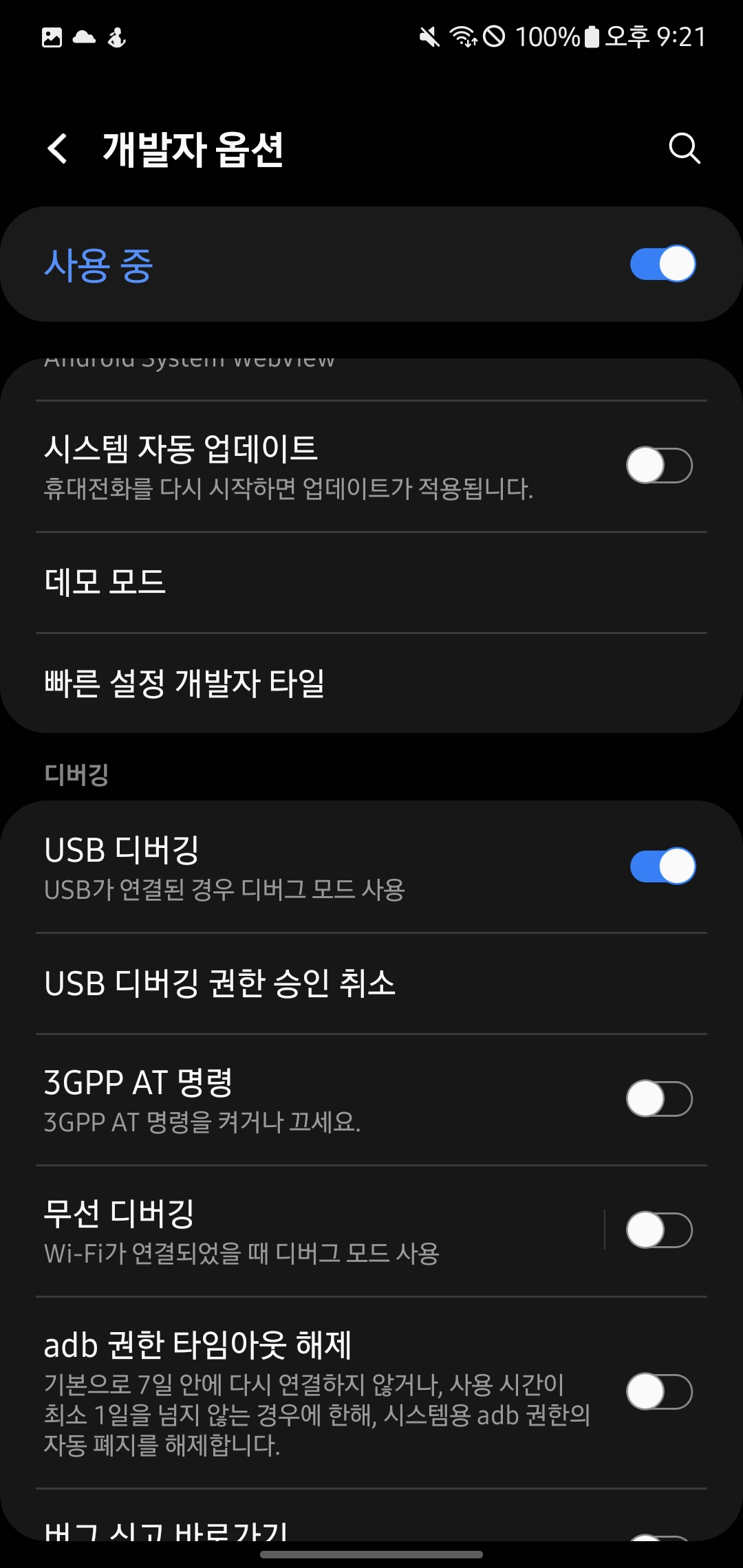 중간의 USB 디버깅을 누르시면 준비 완료입니다.