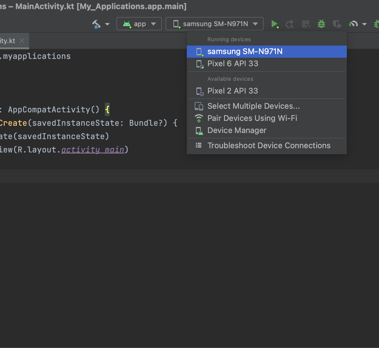 필자는 안드로이드 스튜디오 Giraffe | 2022.3.1 Patch 1을 사용하고 있고 사용하는 안드로이드 휴대폰은 갤럭시노트 10(Android 12)을 사용하고 있습니다.