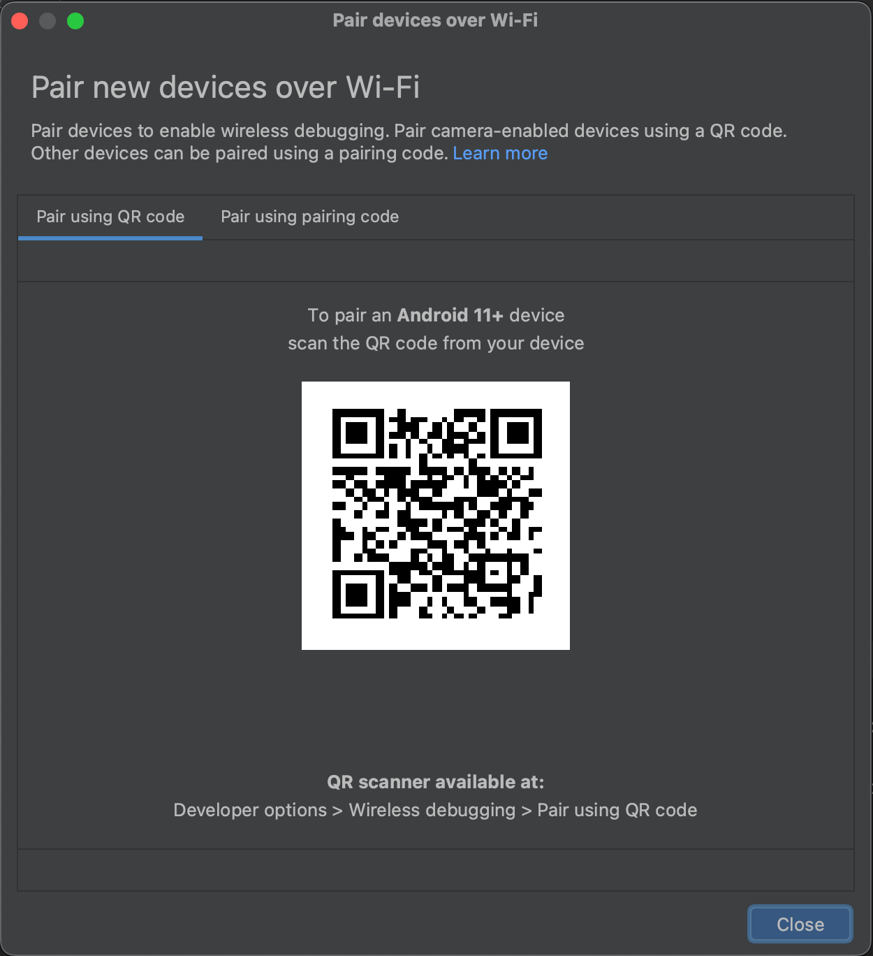 텍스트를 눌러 들어가시면 위의 화면이 뜹니다. Use Wireless debugging을 킨 후, QR코드로 기기 페어링에 들어가 봅시다.