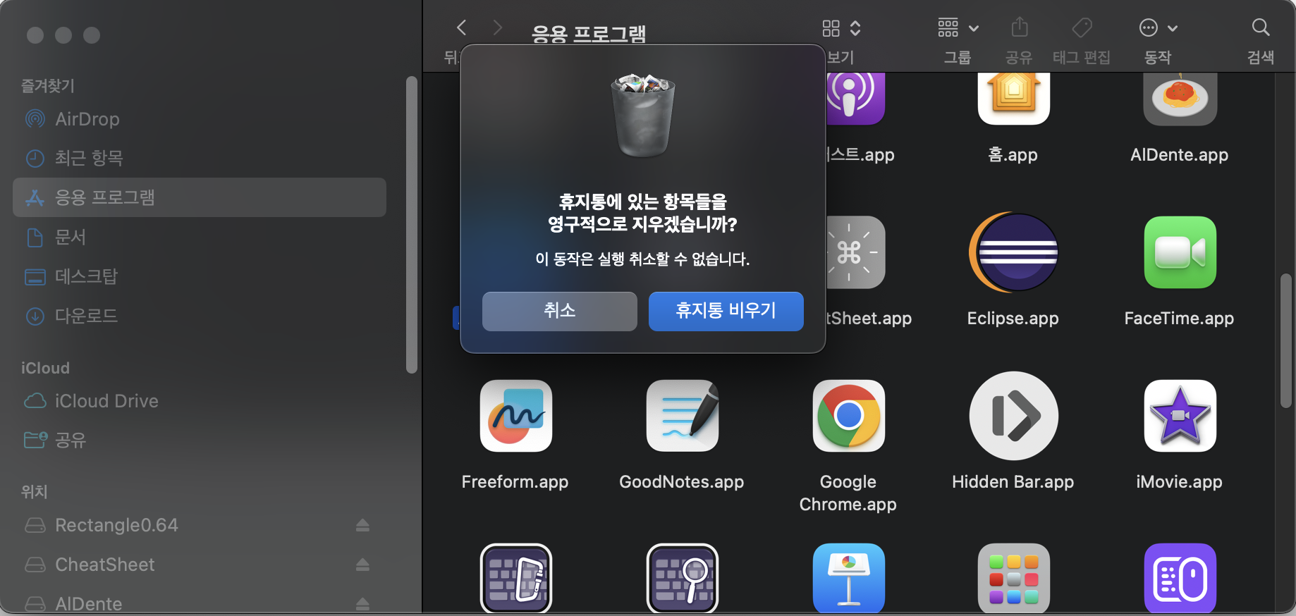위의 방식과 마찬가지로, Finder > 응용프로그램에서 삭제하려는 앱을 우클릭해서 휴지통으로 이동을 누르고 휴지통을 비워주시면 끝납니다.