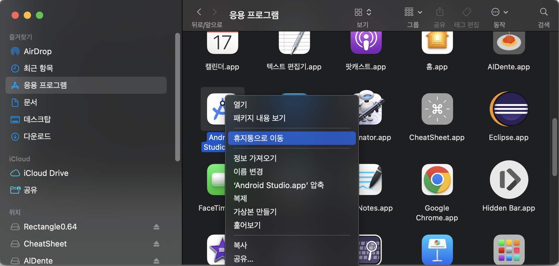 Finder > 응용프로그램에 Android Studio.app이 뜬 걸 볼 수 있습니다.