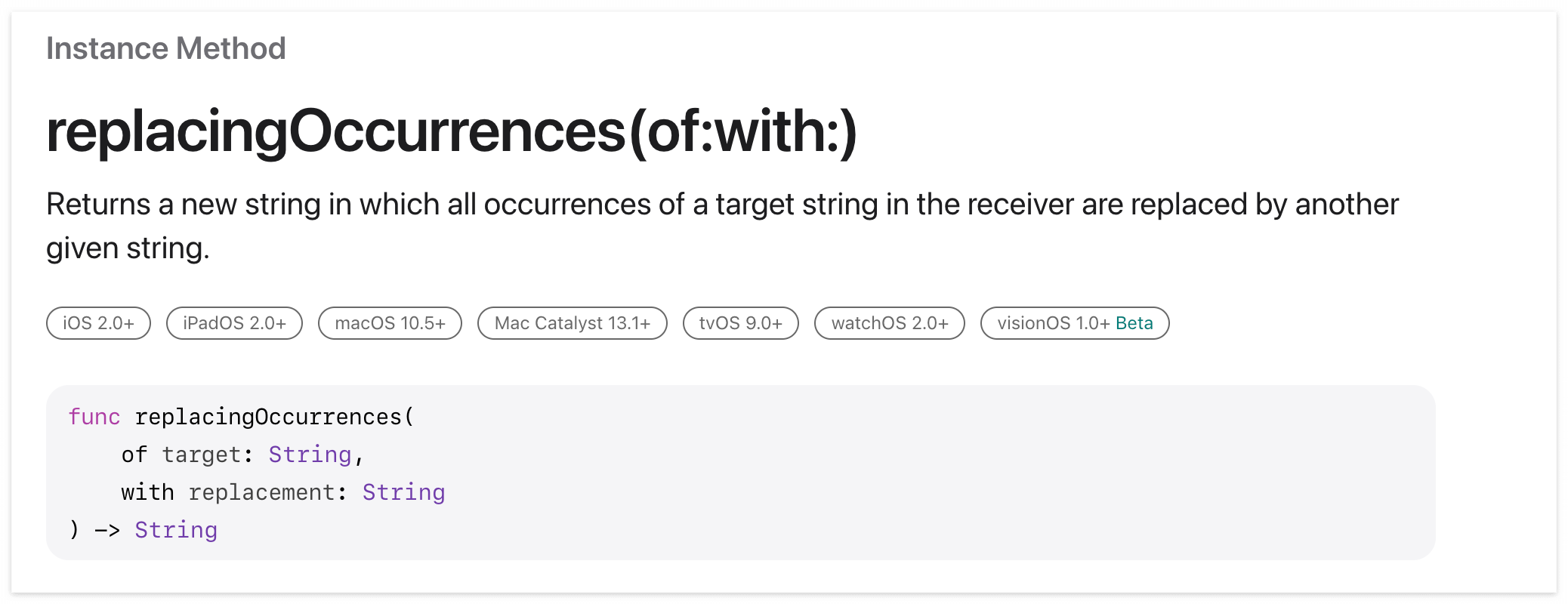 그리고 여기서 replacingOccurrences라는 게 쓰였는데 이것도 한번 알아보죠.