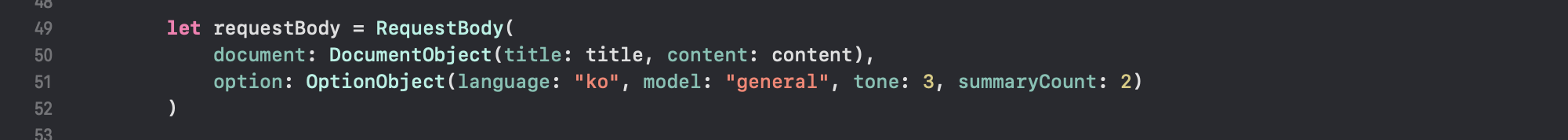 SummaryModel.Swift에 있는 option부분을 건드려 Summary 문서에 있는 것처럼 요약 내용을 변경 가능합니다.