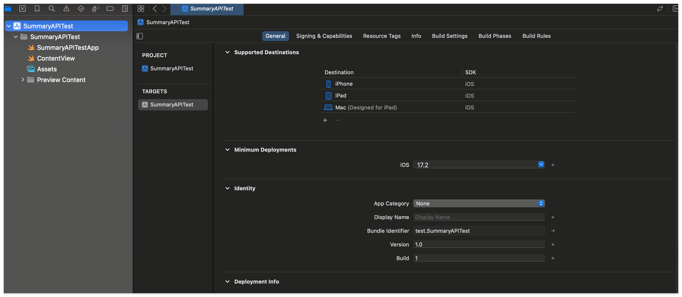 Application 이름은 각자 앱 이름으로 하면 됩니다. 저는 임시로 SummaryAPITest라고 해두었습니다.