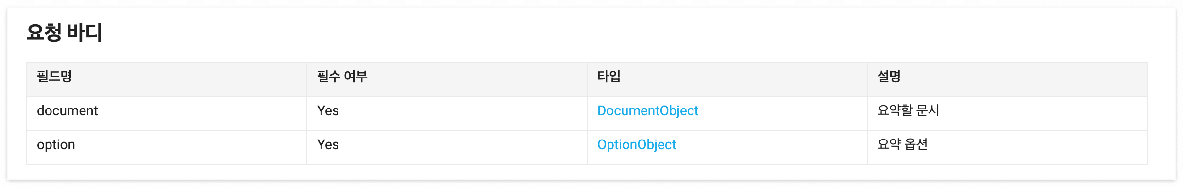 document, option이라는 요청바디가 필요하고 이것들은 DocumentObject, OptionObject로 세분화되어있습니다.