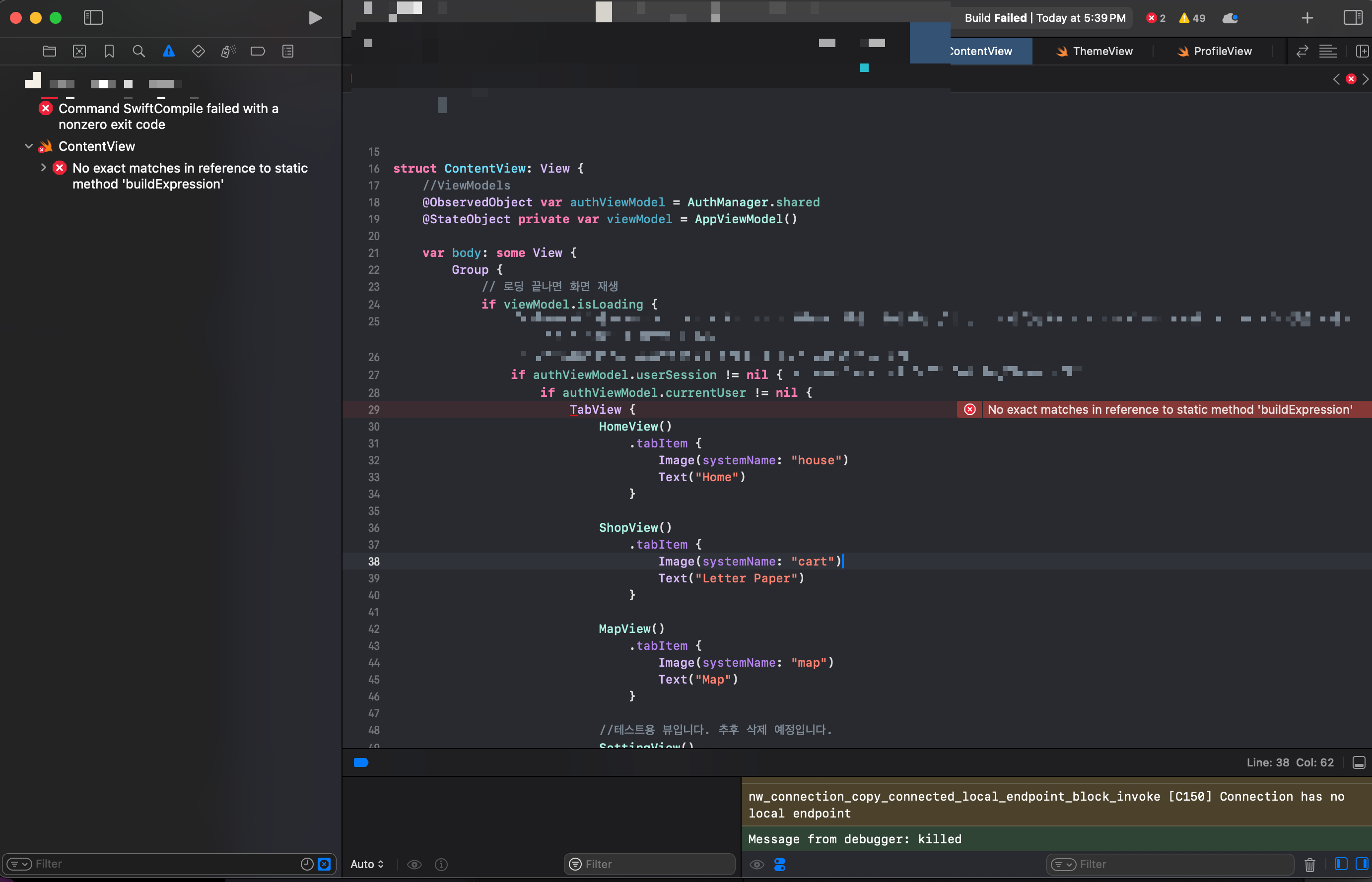 평화롭게 개발을 다 하고 빌드를 했는데, 건들지도 않았던 ContentView에 처음 보는 에러가 떴습니다.