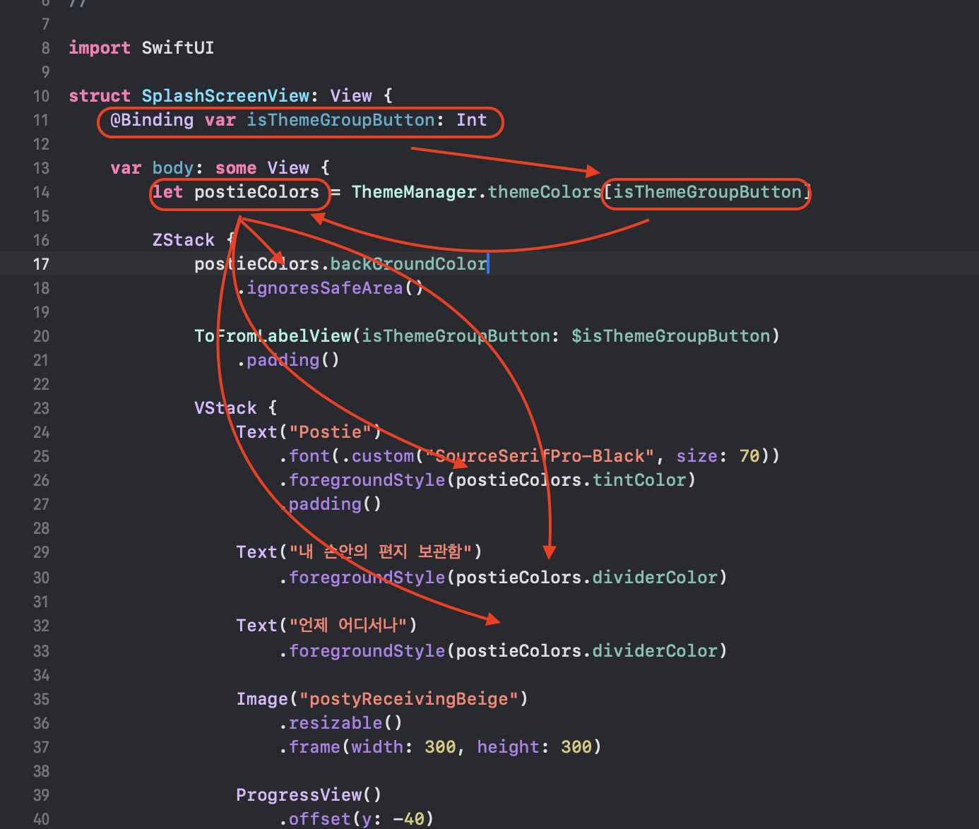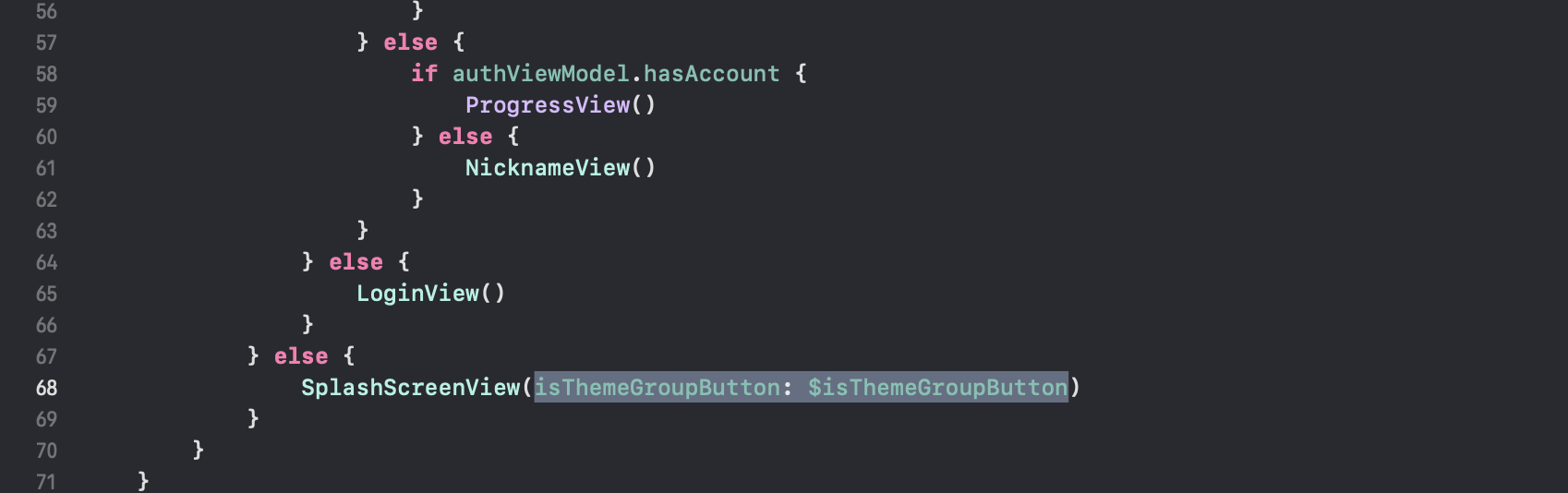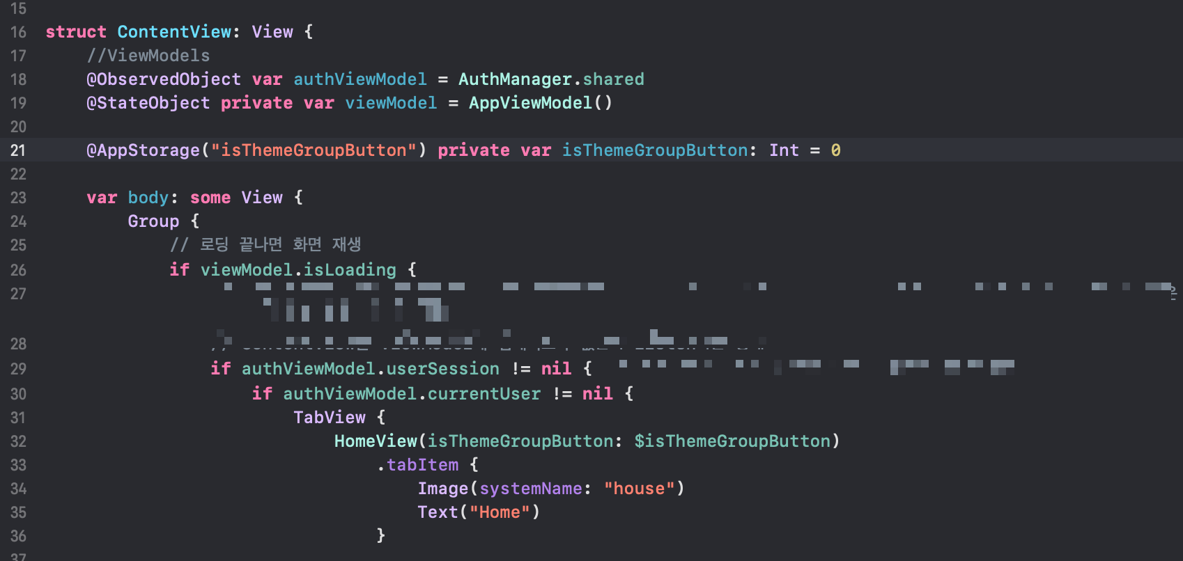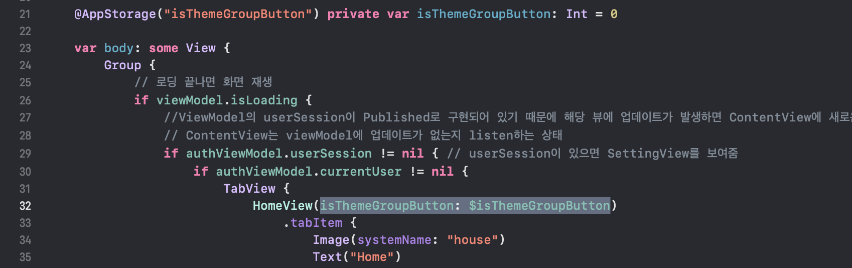 그러나 SplashScreenView에 있는 isThemeGroupButton를 TabView안의 HomeView에 선언을 해두었기에 HomeView가 실행되어야 isThemeGroupButton 값이 생기는데, SplashScreenView를 먼저 띄워야 하다보니 isThemeGroupButton의 초기값이 없어서 에러가 난 것이었습니다. (아니 이럴 거면 SplashScreenView에 에러가 뜨지 왜 괜한 TabView에 떠서 삽질을 하게 만드냐...)